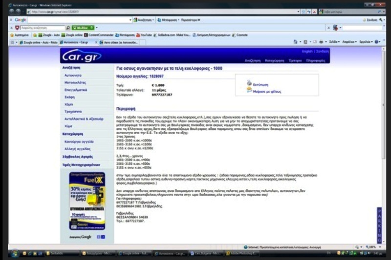 «Εάν τα έξοδα του αυτοκινήτου σας (τέλη κυκλοφορίας, κ.τ.λ.) σας έχουν εξαναγκάσει να θέσετε το αυτοκίνητο προς πώληση ή να παραδώσετε τις πινακίδες του, έχουμε την πλέον οικονομικότερη λύση για να μην το αποχωριστείτε! Σας προτείνουμε να σας μετατρέψουμε το αυτοκίνητό σας με βουλγαρικές πινακίδες είναι άκρως νομιμότατο, δοκιμασμένο, δεν υπάρχει κίνδυνος κατάσχεσης από τις ελληνικές αρχές, διότι σας εξασφαλίζουμε βουλγαρική άδεια παραμονής, όπου σας δίνει επιπλέον δικαίωμα να αγοράσετε αυτοκίνητα από την Ε.Ε. Τα έξοδα είναι τα εξής: