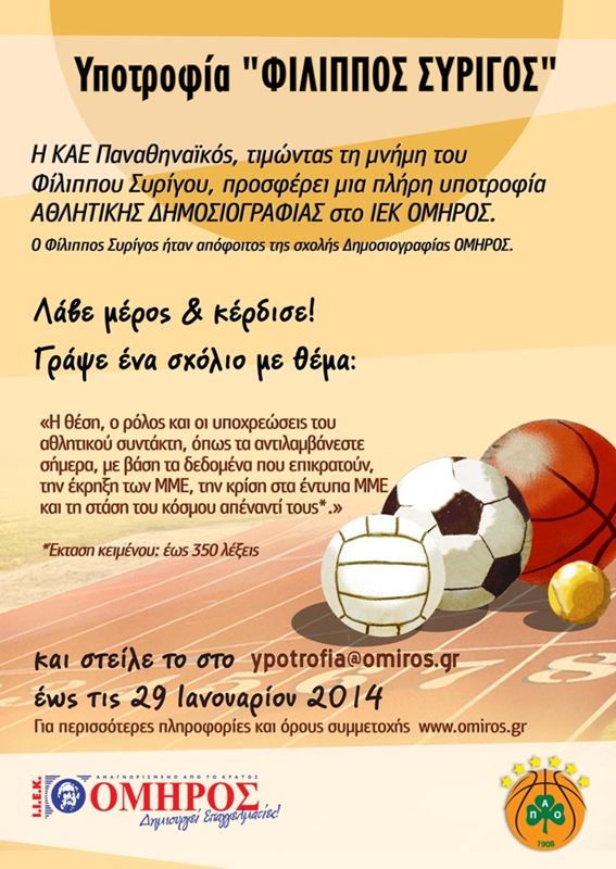 «Η ΚΑΕ Παναθηναϊκός θέλοντας να τιμήσει τη μνήμη του κορυφαίου δημοσιογράφου Φίλιππου Συρίγου θεσμοθέτησε υποτροφία σπουδών αθλητικής δημοσιογραφίας στο ΙΕΚ Όμηρος. Το ενδιαφέρον που έχει ήδη εκφραστεί από υποψηφίους συν το γεγονός ότι μεσολάβησε εορταστική περίοδος υποχρεώνει στο να δοθεί χρονική παράταση στην υποβολή των γραπτών μέχρι και τις 29/1/2014.