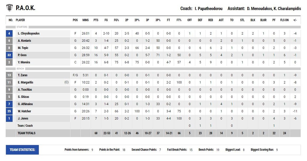 Εκτός από τον Σέρβο σέντερ κοντά στο τριπλ νταμπλ έφτασε ο Γιώργος Πρίντεζης που είχε 19 πόντους, εννιά ριμπάουντ και έξι ασίστ. Για την ομάδα της Θεσσαλονίκης που ήταν ανταγωνιστική αλλά στο τέλος πλήρωσε την κούραση από τα συνεχόμενα ματς οι Φιλ Γκος και Γιανίκ Μορέιρα είχαν από 16 πόντους έκαστος ενώ ο Μιλένκο Τέπιτς σταμάτησε στους 10 πόντους.