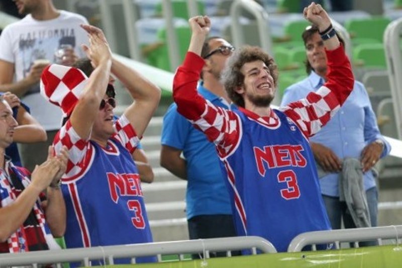 Φανέλα του Ντράζεν Πέτροβιτς από την εποχή που αγωνιζόταν στο ΝΒΑ και τους τότε Νιου Τζέρσεϊ Νετς φορούν φίλαθλοι της Κροατίας στη Λουμπλιάνα.