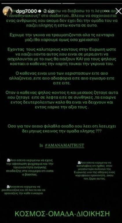 Ο διοικητικός ηγέτης των «πράσινων», μέσω του προσωπικού του προφίλ στο Instagram έστειλε το δικό του μήνυμα, με αφορμή τα όσα ακούγονται και γράφονται το τελευταίο διάστημα για τον Παναθηναϊκό AKTOR.
