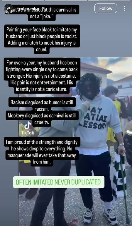 H σύζυγος του Ματίας Λεσόρ ξέσπασε με ανάρτηση της για έναν άνθρωπο στο καρναβάλι της Πάτρας που θέλησε να μιμηθεί τον Γάλλο σέντερ σε μια αμφίεση που ξεπέρασε κάθε όριο.
