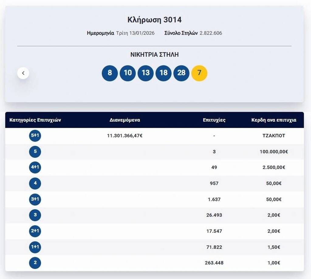 Οι τυχεροί αριθμοί είναι 10, 8, 28, 13, 18 και Τζόκερ το 7.