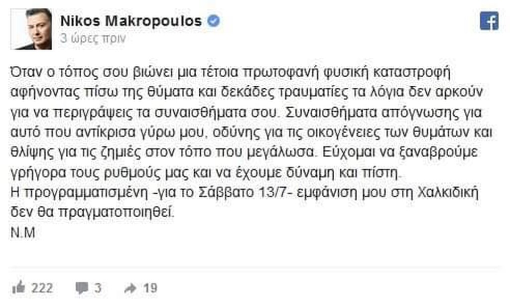 Ο Νίκος Μακρόπουλος με αφορμή την ακύρωση της προγραμματισμένης του εμφάνισης στην Χαλκιδική στο πλαίσιο της καλοκαιρινής του περιοδείας, με ανάρτηση του στα μέσα κοινωνικής δικτύωσης αναφέρθηκε στην θεομηνία που έπληξε τον τόπο που μεγάλωσε.