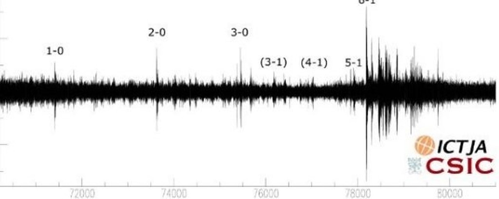 Στο σχετικό γράφημα, μάλιστα, που δόθηκε στη δημοσιότητα έχουν αποτυπωθεί με χαρακτηριστικό τρόπο οι αντιδράσεις των περίπου 90.000 οπαδών που ήταν στο γήπεδο το βράδυ της Τετάρτης σε κάθε γκολ των «μπλαουγκράνα» και πως προκλήθηκε ο... σεισμός στο 6-1.