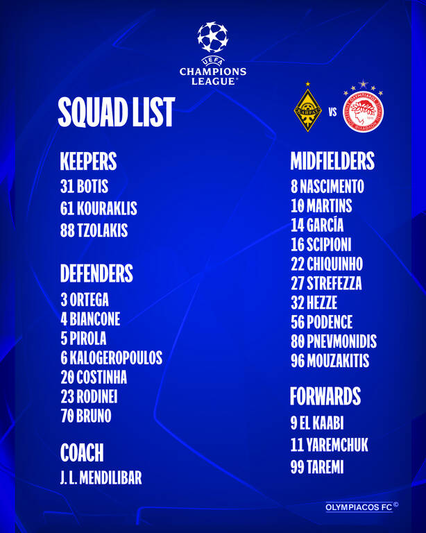 Τόσο ο Ντάνιελ Ποντένσε, όσο κι ο Τσικίνιο, οι οποίοι ξεπέρασαν τα προβλήματα τραυματισμών τους βρίσκονται στη διάθεση του Ισπανού τεχνικού. Αντίθετα, εκτός παραμένει ο Παναγιώτης Ρέτσος, ο οποίος χτύπησε στον αγώνα με τον Παναιτωλικό.