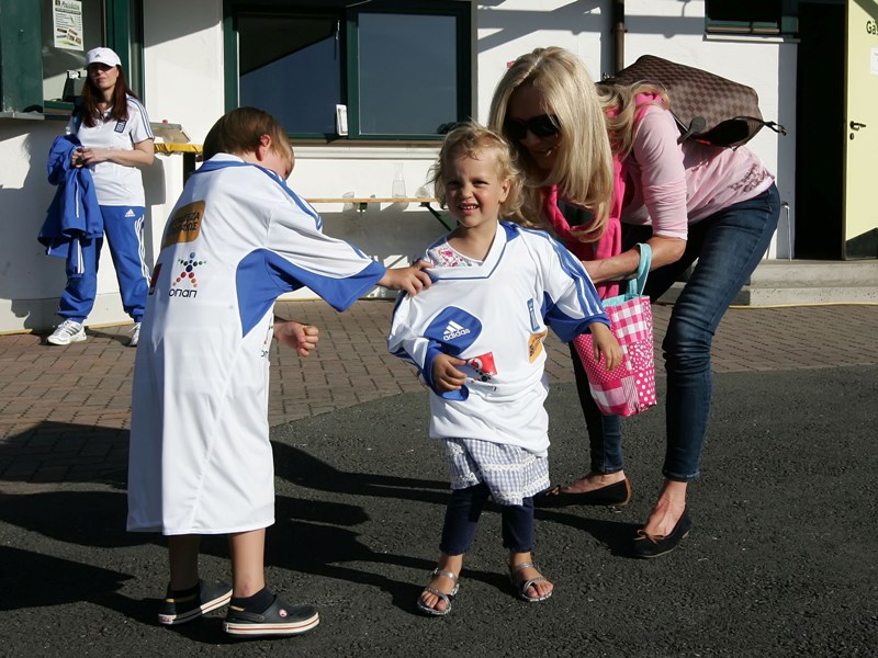Δύο πιτσιρίκια, ένα αγοράκι και ένα κοριτσάκι, ηλικίας περίπου τριών και τεσσάρων ετών, έκλέψαν την... παράσταση μετά το τέλος της σημερινής (25/5) προπόνησης της Εθνικής, στο Κίτσμπουελ, καθώς πήγαν και ζήτησαν αυτόγραφα από τους διεθνείς ποδοσφαιριστές της Εθνικής.