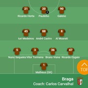 Η ενδεκάδα της Μπράγκα: Ματέους, Τόρμενα, Σεκέιρα, Μπρούνο Βιάνα, Εσγάιο, Αντρέ Κάστρο, Αλ Μουσράτι, Μεδέιρος, Γκαλένο, Παουλίνιο, Ρικάρντο Όρτα.