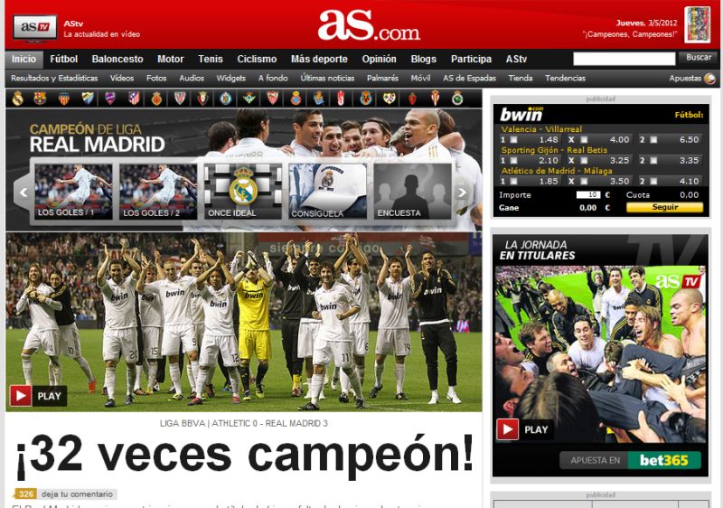 Συγκεκριμένα, η Marca, η οποία είναι προσκείμενη στην Ρεάλ Μαδρίτης, αναφέρεται στον Ζοζέ Μουρίνιο και στους παίκτες του με αποθεωτικά σχόλια, ενώ όλη η ιστοσελίδα της, αλλά και το σημερινό της φύλο, είναι αφιερωμένα στο 32ο πρωτάθλημα των «μερένχες».