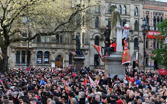 Χιλιάδες οπαδοί των «κόκκινων διαβόλων» βγήκαν στους δρόμους της αγγλικής πόλης για να αποθεώσουν τους παίκτες, οι οποίοι τους έδειχναν το τρόπαιο από την οροφή του πούλμαν της ομάδας.