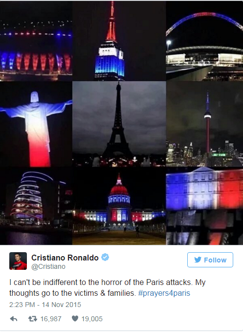 "Δεν μπορώ να είμαι αδιάφορος για τον τρόμο της επίθεσης στο Παρίσι. Οι σκέψεις μου βρίσκονται στα θύματα και στις οικογένειές τους", ανέφερε ο "CR7".