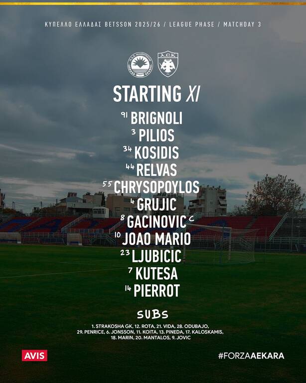 Δείτε τις επιλογές του Μάρκο Νίκολιτς ενόψει του Ηλιούπολη – ΑΕΚ, για την 3η αγωνιστική της League Phase στο Κύπελλο Ελλάδας.