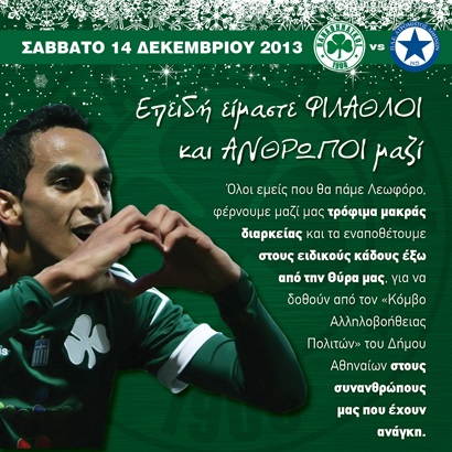 Κάλεσμα αλληλεγγύης στους φιλάθλους του που θα βρεθούν στον αγώνα με τον Ατρόμητο το Σάββατο (14/12) στη Λεωφόρο έκανε ο Παναθηναϊκός προκειμένου να βοηθηθούν συνάνθρωποί μας.