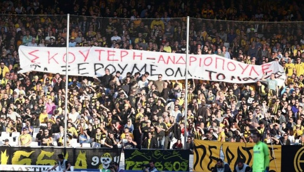 Πανό με αποδέκτη τον δικαστή Σκουτέρη εμφανίστηκε στο ΟΑΚΑ από τους οπαδούς της ΑΕΚ. Εν αναμονή της απόφασης για την έφεση του ΠΑΟΚ το επίμαχο πανό έγραφε «Σκουτέρη, Ανδριόπουλε τα ξέρουμε όλα. Το νου σας».