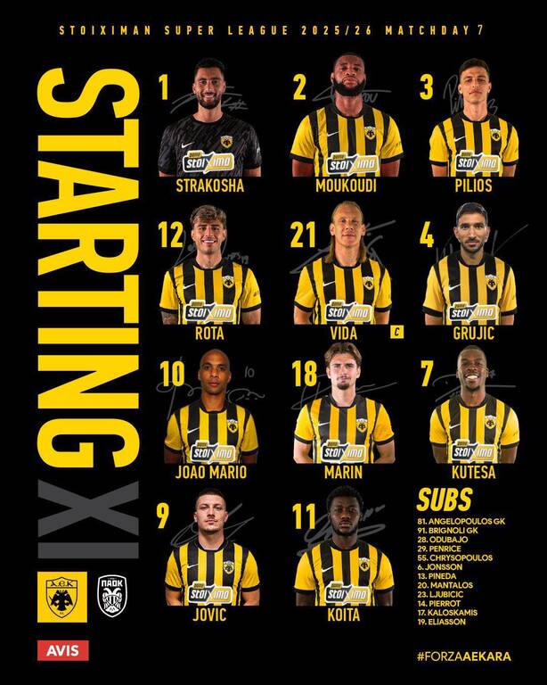 Η ενδεκάδα της ΑΕΚ: Στρακόσα, Μουκουντί, Πήλιος, Ρότα, Βίντα, Γκρούγιτς, Ζοάο Μάριο, Μαρίν, Κουτέσα, Γιόβιτς, Κοϊτά, ενώ στον πάγκο είναι οι: Αγγελόπουλος, Μπρινιόλι, Οντουμπάτζο, Πένραϊς, Χρυσόπουλος, Γιόνσον, Πινέδα, Μάνταλος, Λιούμπιτσιτς, Πιερό, Καλοσκάμης, Ελίασον.