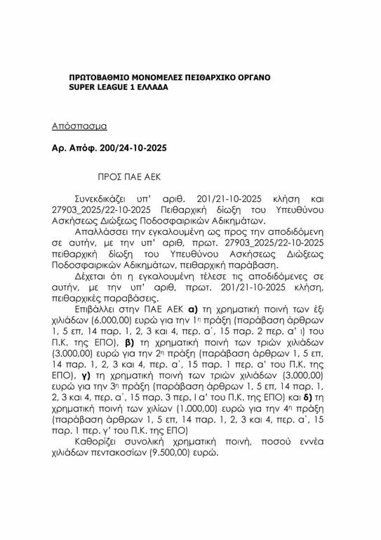 Το Πρωτοβάθμιο Μονομελές Πειθαρχικό Όργανο αποφάσισε να απαλλάξει την ΑΕΚ από οποιαδήποτε κατηγορία. Για κάποια άλλα παραπτώματα, όπως καπνογόνα, λέιζερ, συνθήματα κλπ. στον ίδιο αγώνα, η «Ένωση» τιμωρήθηκε με συνολικό πρόστιμο 9.500 ευρώ.