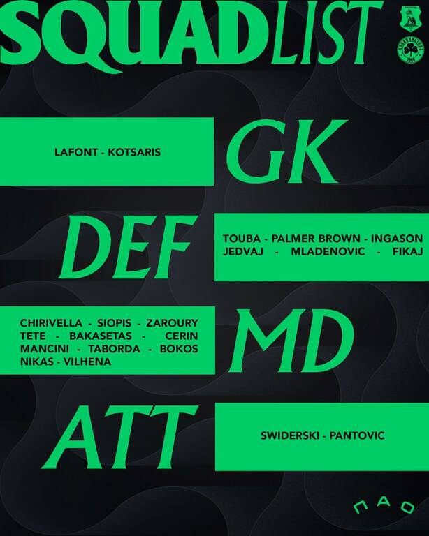 Η αποστολή του Παναθηναϊκού για τις Σέρρες: Λαφόν, Κότσαρης, Τσιριβέγια, Τουμπά, Σιώπης, Ζαρουρί, Τετέ, Μπακασέτας, Πάλμερ – Μπράουν, Ίνγκασον, Τσέριν, Μαντσίνι, Σφιντέρσκι, Ταμπόρδα, Γεντβάι, Μλαντένοβιτς, Φικάι, Μπόκος, Νίκας, Βιλένα, Πάντοβιτς.