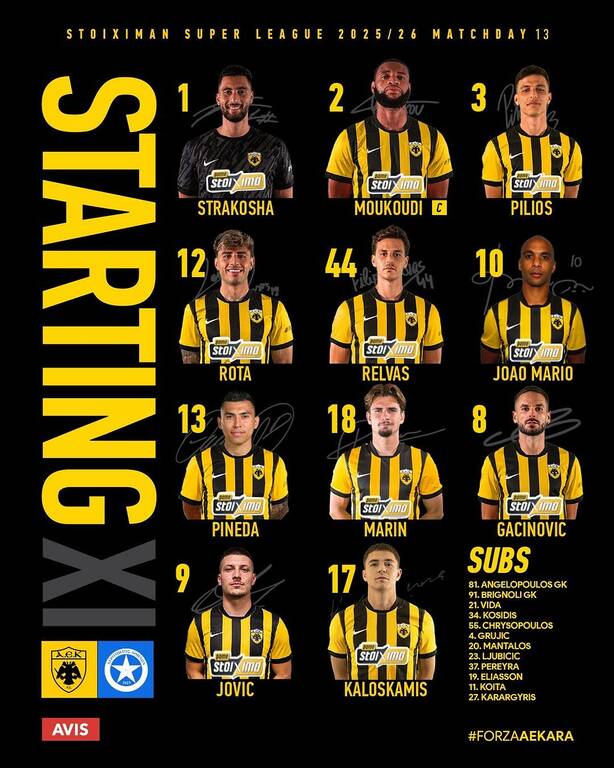 Η ενδεκάδα της ΑΕΚ: Στρακόσα, Ρότα, Μουκουντί, Ρέλβας, Πήλιος, Μαρίν, Πινέδα, Ζοάο Μάριο, Καλοσκάμης, Γκατσίνοβιτς, Γιόβιτς, ενώ στον πάγκο είναι οι: Αγγελόπουλος, Μπρινιόλι, Βίντα, Κοσίδης, Χρυσόπουλος, Γκρούγιτς, Μάνταλος, Λιούμπιτσιτς, Περέιρα, Ελίασον, Κοϊτά, Καραργύρης.