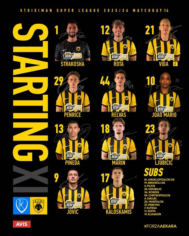 Η ενδεκάδα της ΑΕΚ: Στρακόσα, Ρότα, Βίντα, Ρέλβας, Πενράις, Μαρίν, Πινέδα, Λιούμπισιτς, Καλοσκάμης, Ζοάο Μάριο, Γιόβιτς, ενώ στον πάγκο βρίσκονται οι: Αγγελόπουλος, Μπρινιόλι, Πήλιος, Οντουμπάτζο, Κοσίδης, Χρυσόπουλος, Γκρούγιτς, Μάνταλος, Περέιρα, Κουτέσα, Κοϊτά, Ελίασον.