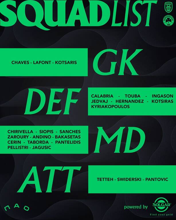 Η αποστολή του Παναθηναϊκού αποτελείται από τους: Λαφόν, Τσάβες, Κότσαρης, Καλάμπρια, Τσιριβέγια, Τουμπά, Σιώπης, Τετέι, Σάντσες, Ζαρουρί, Αντίνο, Μπακασέτας, Ίνγκασον, Τσέριν, Σφιντέρσκι, Ταμπόρδα, Γεντβάι, Παντελίδης, Ερνάντεθ, Κώτσιρας, Πελίστρι, Πάντοβιτς, Κυριακόπουλος, Γιάγκουσιτς.