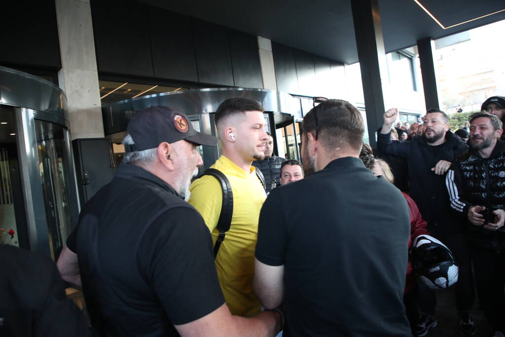 Εκατοντάδες έδωσαν το «παρών» έξω από κεντρικό ξενοδοχείο της Αθήνας, όπου αποθέωσαν τον Μάρκο Νίκολιτς και τους ποδοσφαιριστές του, φωνάζοντας συνθήματα.