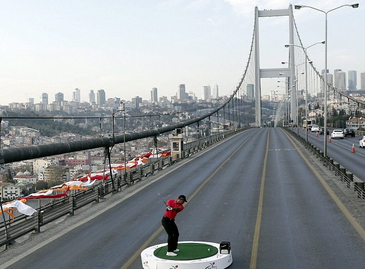 Ο Γουντς έστειλε την μπάλα του γκολφ κατά μήκος της γέφυρας του Βοσπόρου που συνδέει τις δύο Ηπείρους. Ο Αμερικανός γκολφέρ προώθησε με αυτόν τον τρόπο ένα τουρνουά γκολφ που θα γίνει στην Αντάλια, νότια της Τουρκίας.