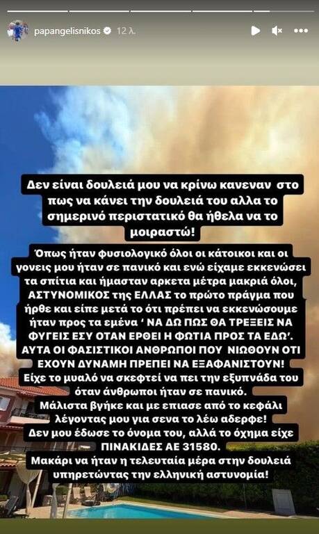 Όπως ήταν φυσιολογικό όλοι οι κάτοικοι και οι γονείς μου ήταν σε πανικό και ενώ είχαμε εκκενώσει τα σπίτια και ήμασταν αρκετά μέτρα μακριά όλοι, αστυνομικός της ΕΛΑΣ το πρώτο πράγμα που ήρθε και είπε μετά το ότι πρέπει να εκκενώσουμε ήταν προς τα εμένα: "Να δω πως θα τρέξεις να φύγεις εσύ όταν έρθει η φωτιά προς τα εδώ". Αυτοί οι φασιστικοί άνθρωποι που νιώθουν ότι έχουν δύναμη πρέπει να εξαφανιστούν!