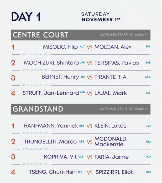 Η πρώτη ημέρα περιλαμβάνει και τον αγώνα του Παύλου Τσιτσιπά, μικρότερου αδερφού του Στέφανου, ο οποίος έλαβε wild card για το ταμπλό των προκριματικών.