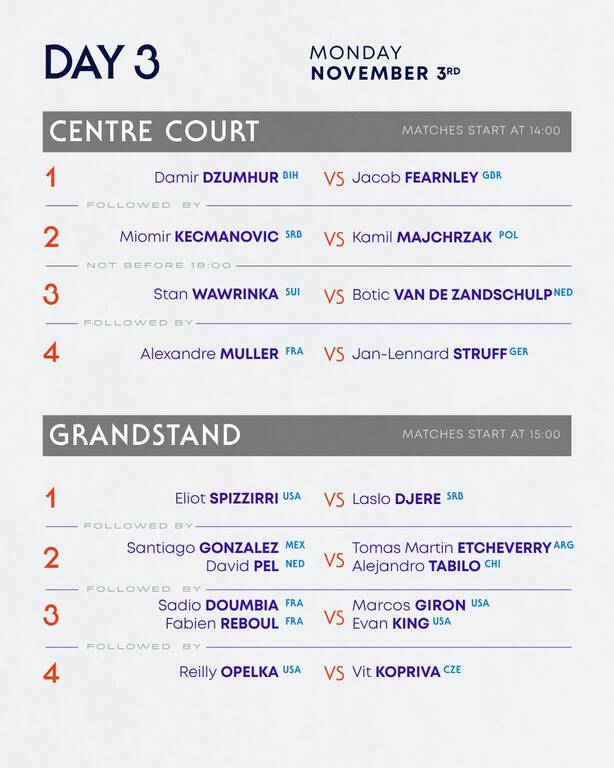 Το πρόγραμμα θα ξεκινήσει στις 14:00 με το παιχνίδι του Νταμίρ Τζουμχούρ κόντρα στον Τζέικομπ Φίρνλεϊ, ενώ αμέσως μετά θα ξεκινήσει ο αγώνας του Μιομίρ Κετσμάνοβιτς με τον Καμίλ Μάιχζρακ. Πρεμιέρα κάνει τη Δευτέρα, τόσο ο Λάσλο Τζέρε, όσο κι ο Ρέιλι Οπέλκα.