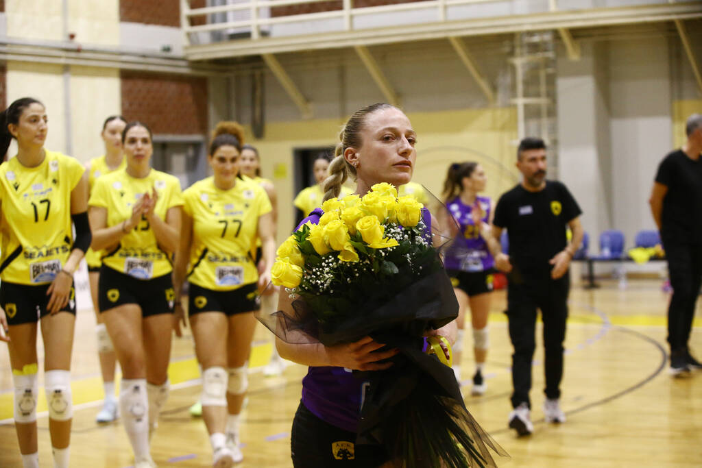 Οι φίλοι της «Ένωσης» τίμησαν τη σπουδαία Πέννυ Ρόγκα, πριν από την έναρξη του ΑΕΚ – Παναθηναϊκός, για τη Volley League Γυναικών – Οι «κιτρινόμαυρες» παρέδωσαν ανθοδέσμη με 21 κίτρινα τριαντάφυλλά για τον αδικοχαμένο Μάριο.