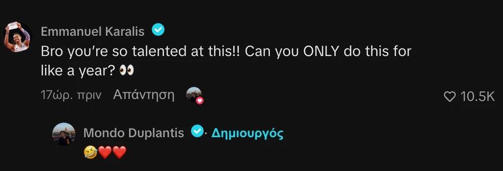 Το σχόλιο έχει γίνει viral με πάνω από 10.000 αντιδράσεις και ο Ντουπλάντις φάνηκε να απολαμβάνει το πείραγμα, απαντώντας με emoji που γελάει και δύο καρδούλες, χωρίς να δείχνει πρόθεση να… συμμορφωθεί.
