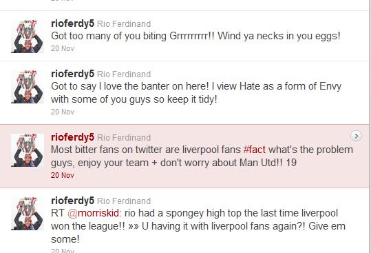 Την... τιμητική της έχει τον τελευταίο καιρό η σελίδα του Ρίο Φέρντιναντ στο Twitter, καθώς ο άσος της Μάντσεστερ Γιουνάιτεντ, λίγες ημέρες μετά την επίθεσή του στον Ζεπ Μπλάτερ... ασχολήθηκε και με τους οπαδούς της Λίβερπουλ.