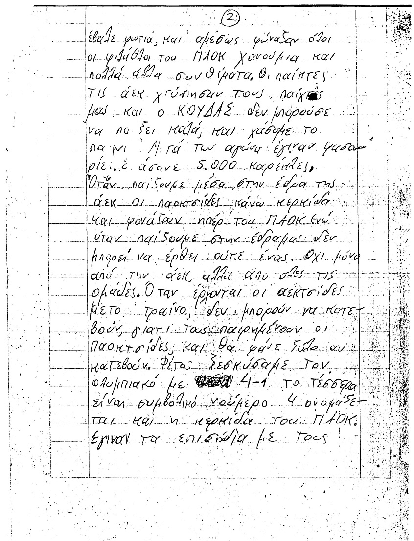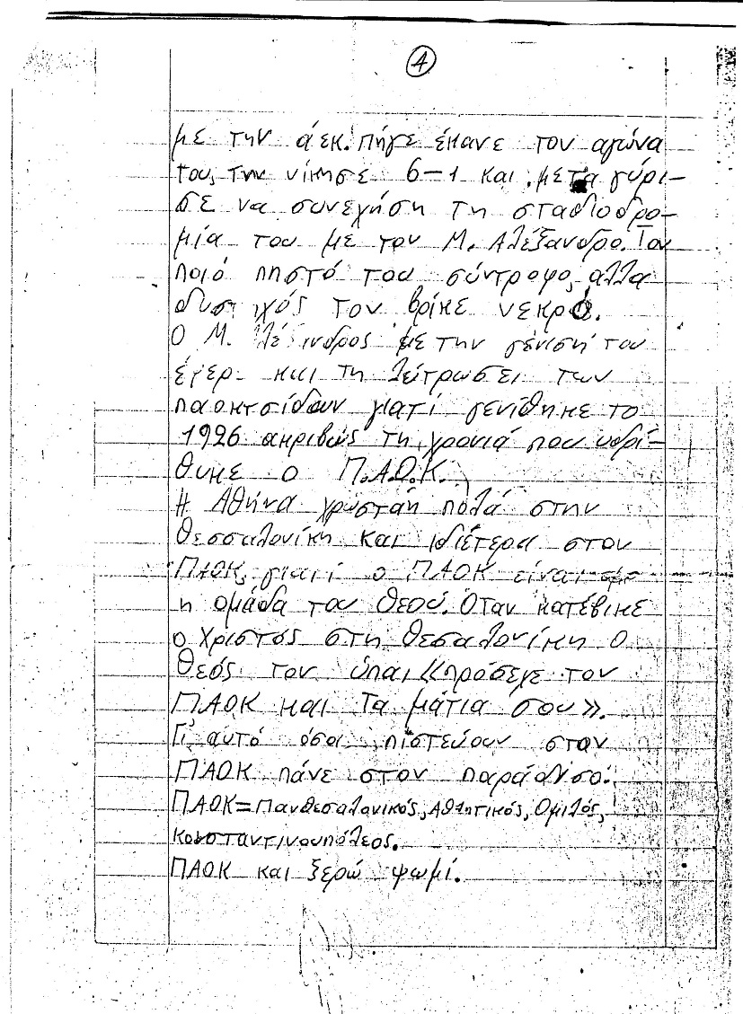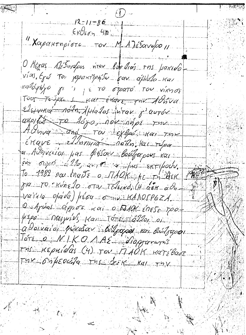 Στην έκθεση, που είναι γραμμένη στις 12 Νοεμβρίου 1986 και βλέπει μετά από τόσα χρόνια το φως της δημοσιότητας μέσω διαδικτύου, ο μαθητής αναφέρει πως ο Μέγας Αλέξανδρος ήταν οπαδός του ΠΑΟΚ και χάρη στην πίστη του στον σύλλογο και με έμβλημα τον δικέφαλο αετό έφτασε μέχρι τις Ινδίες.