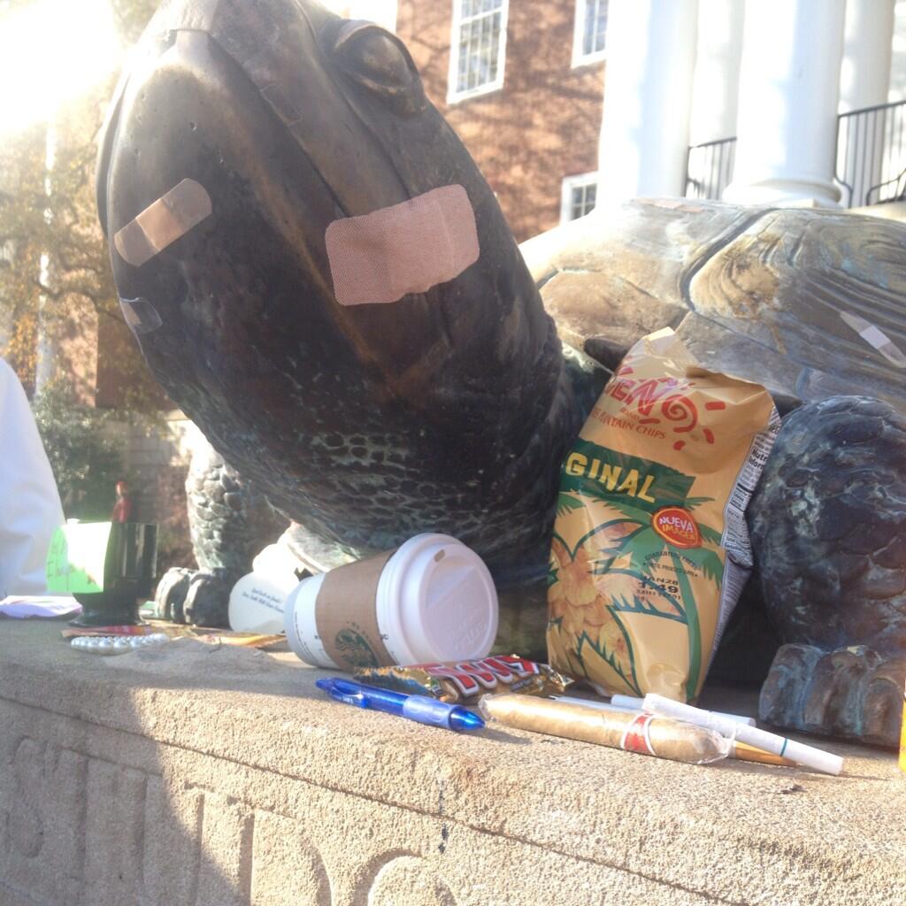Οι φοιτητές του Maryland συνηθίζουν να τοποθετούν αντικείμενα γύρω από το άγαλμα της μασκότ σε ένδειξη συμβολισμού και το έκαναν και κατά τη διάρκεια των τελικών αυτή την εβδομάδα. Αλλά η παράδοσή τους αυτή τη φορά «καταστράφηκε», αφού τα αντικείμενα έπιασαν φωτιά τα μεσάνυχτα της Τετάρτης σύμφωνα με την «Baltimore Sun».